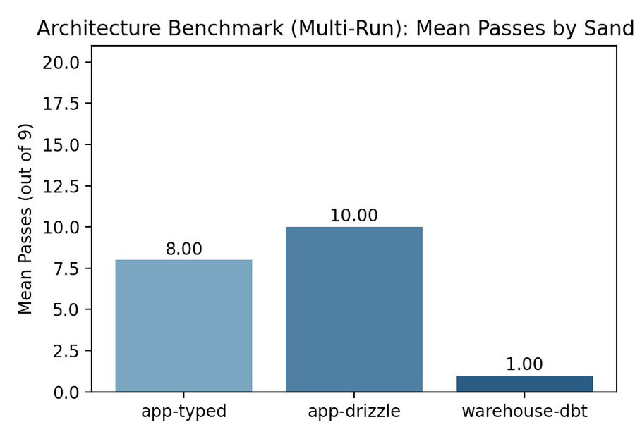 Across 7 LLM models, warehouse+dbt had a 5% pass rate. App-unified architectures had 38-48%.