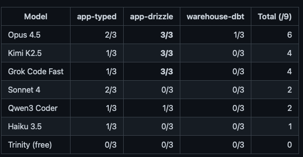 Small n, synthetic data, single-pass runs for some models, no full dbt compilation. This is directional, not definitive. Run it yourself, add harder tasks, prove me wrong.