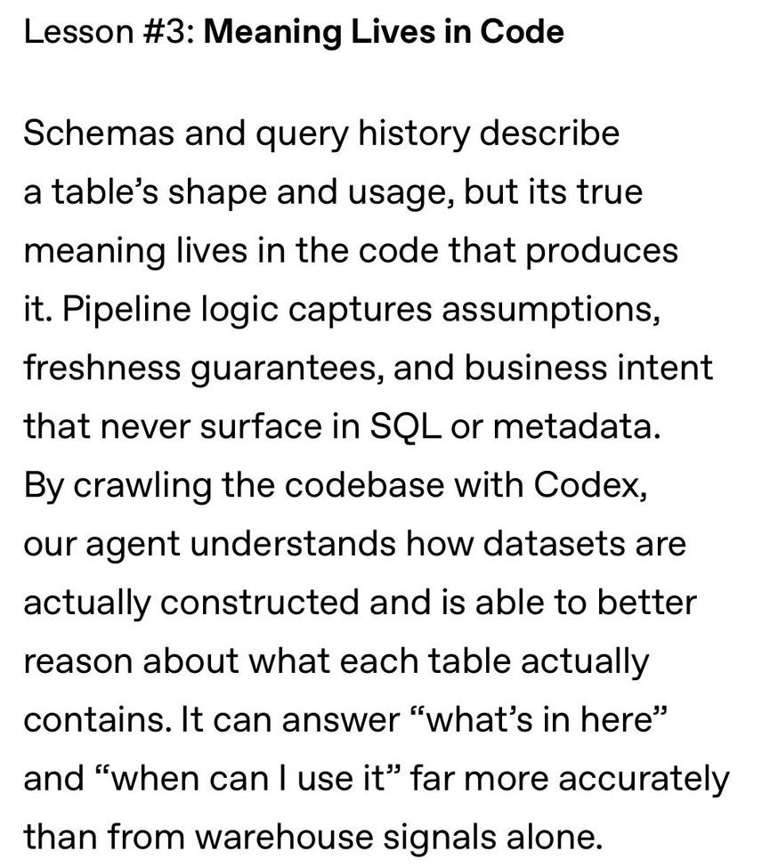 What surprised me was looking at OpenAI’s data warehouse. On the surface it looked sophisticated: context layers, embeddings, all the works. But at the core, two things stood out.